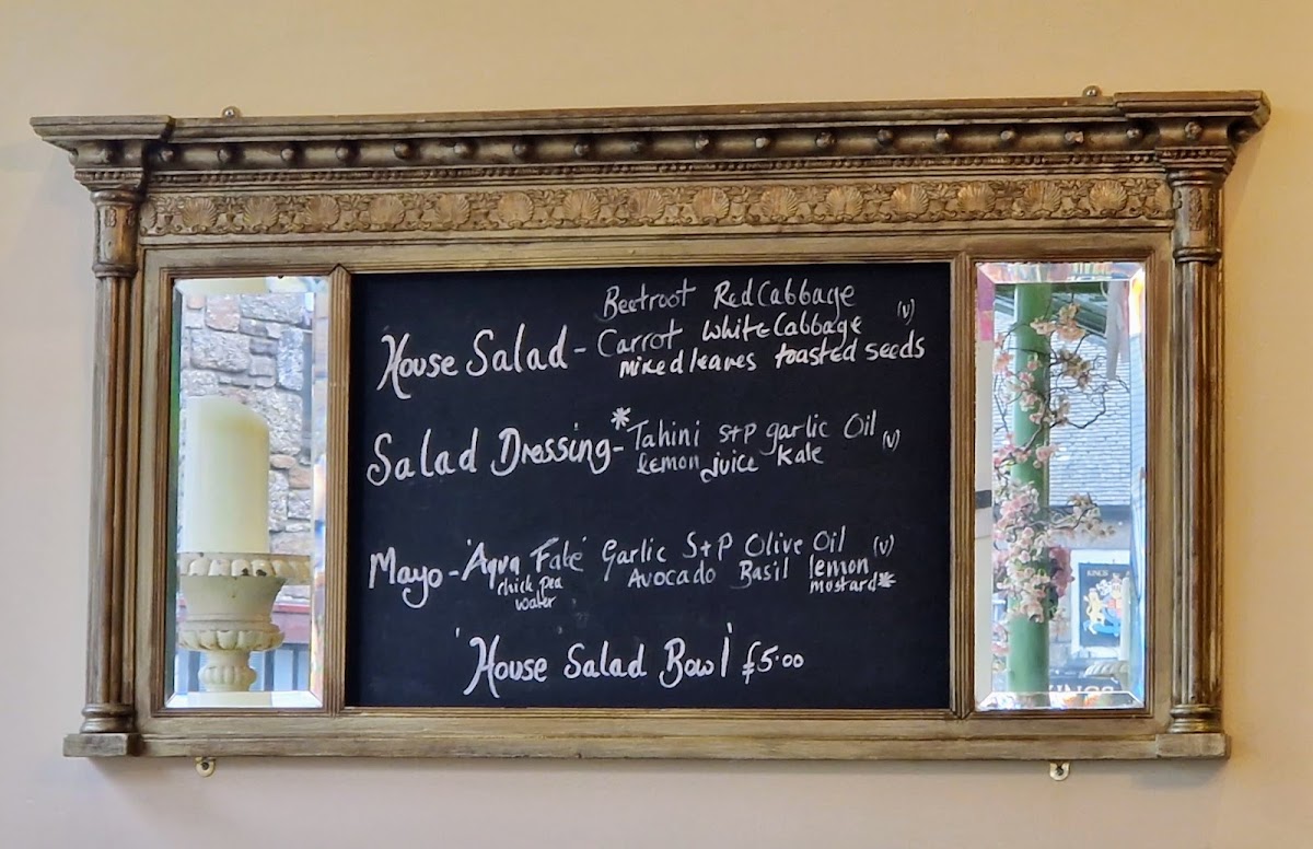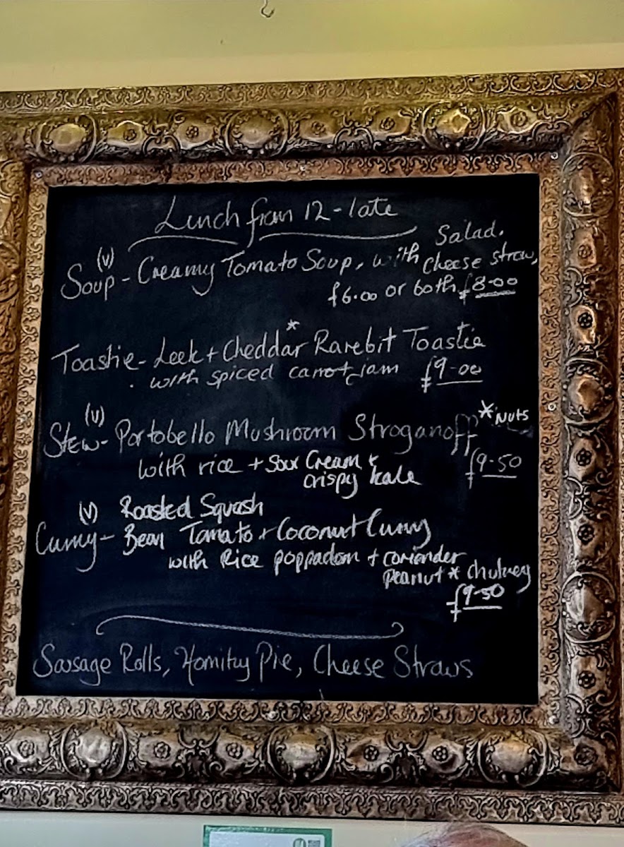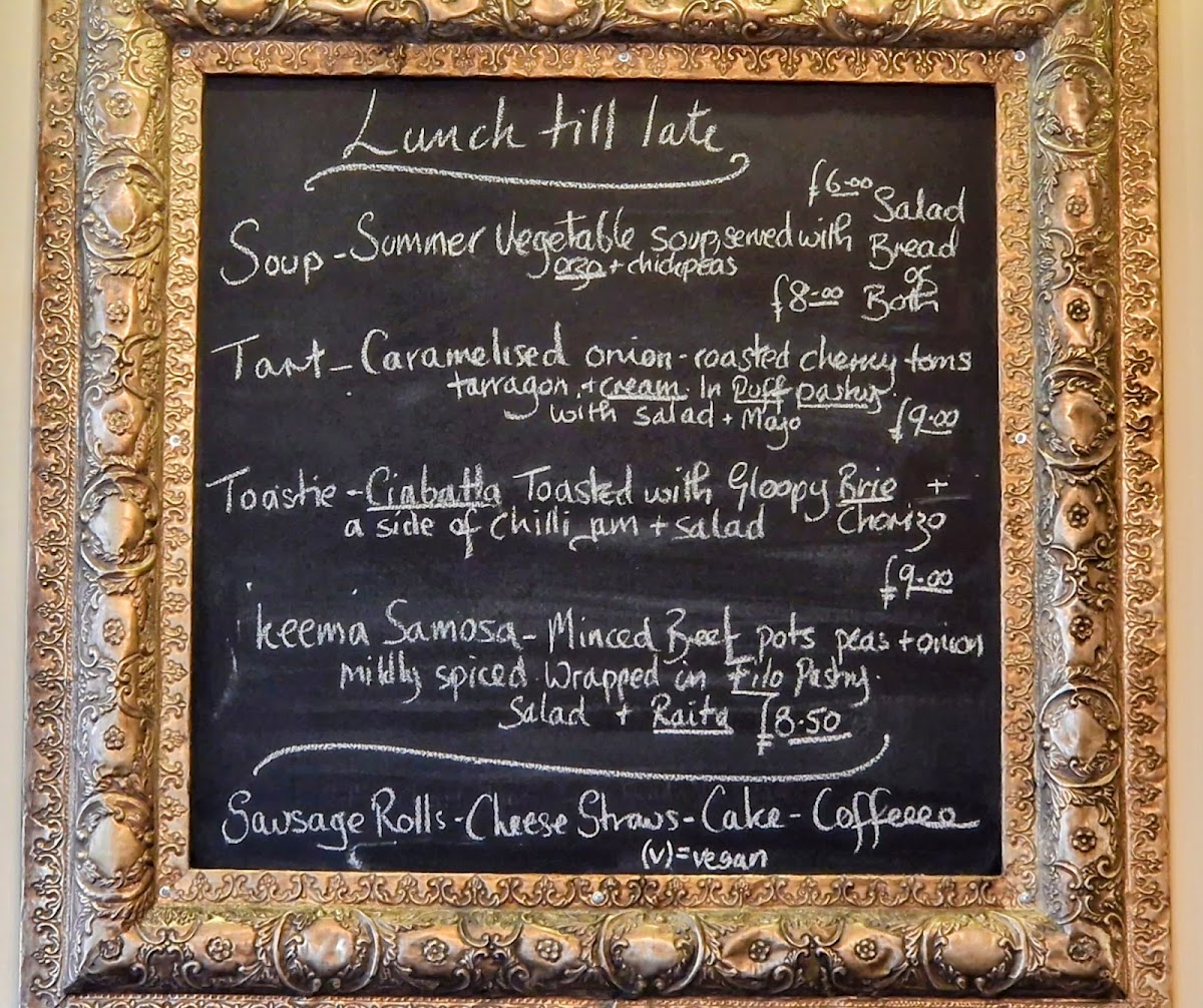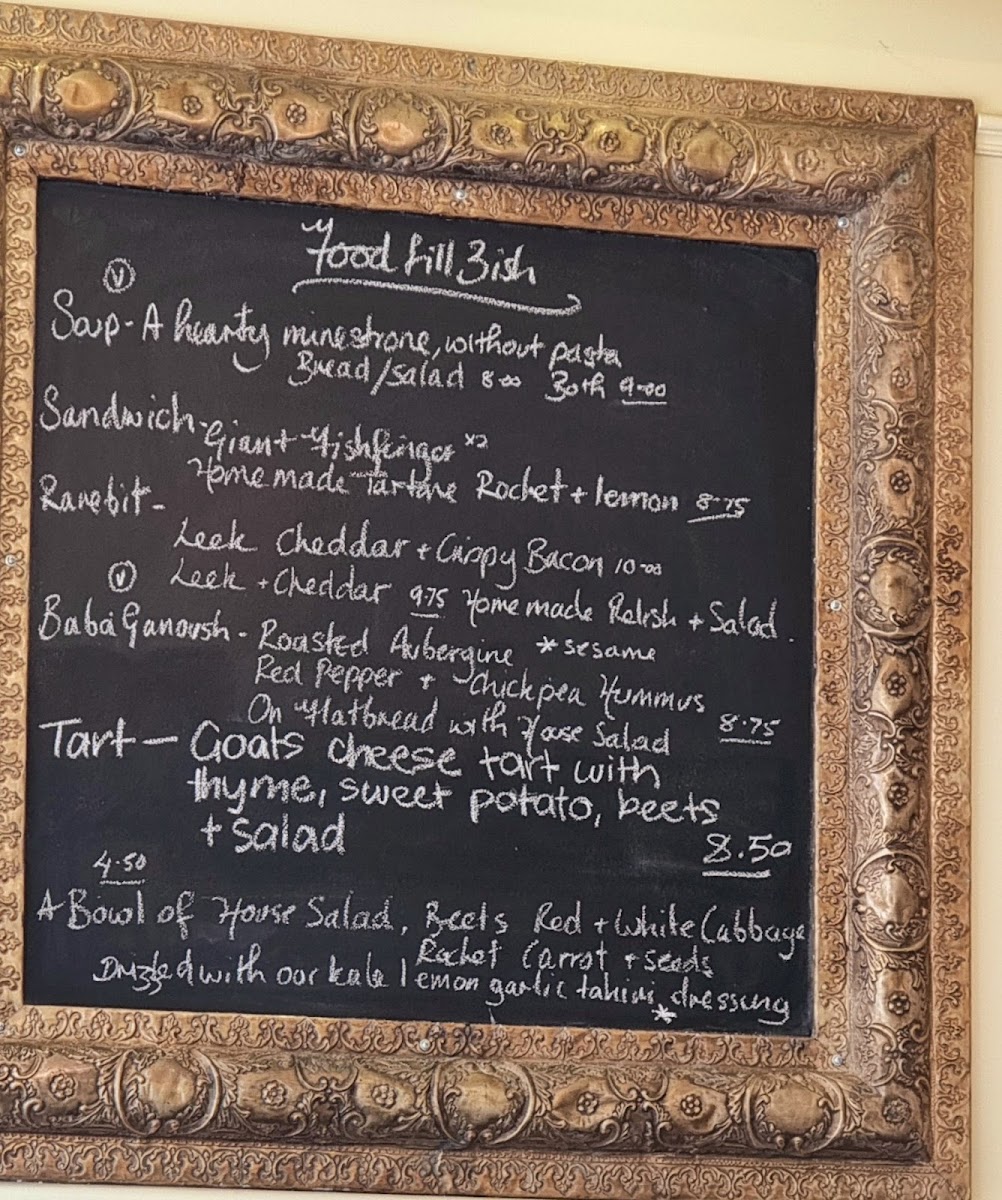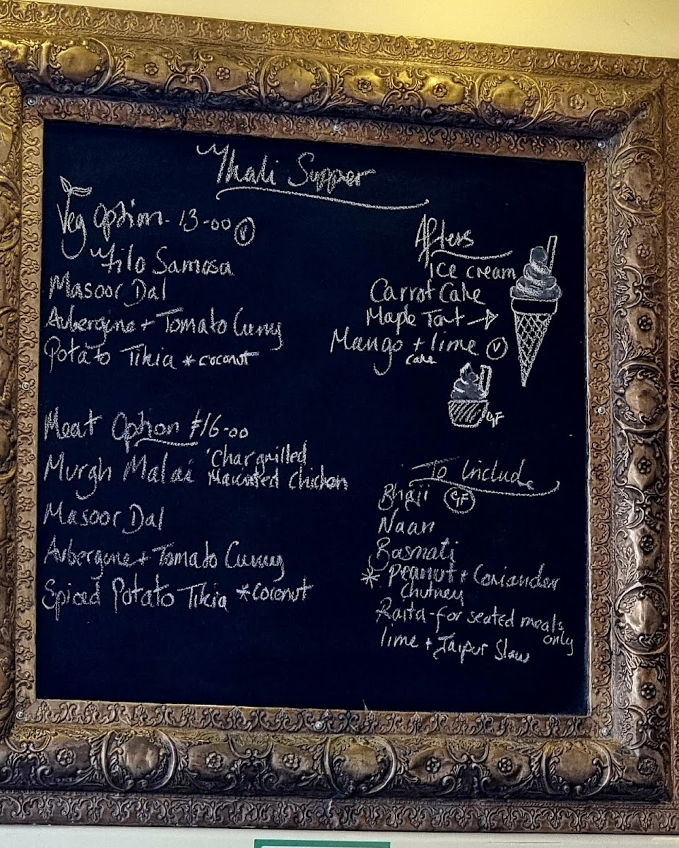 Food items are organized into several categories featuring light bites, main dishes, and desserts. Light options include bakery items like focaccia, cinnamon rolls, scones, and avocado toast. For main courses, the menu highlights include a Thali supper, tarts such as bacon, caramelised onion and cheddar served with salad, as well as dishes incorporating ingredients like okra, pakora, and butternut squash. Salads, chutneys, and kimchi are also part of the offering, providing a range of accompaniments and side dishes.